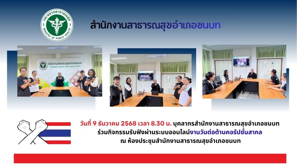 สำนักงานสาธารณสุขอำเภอชนบท ร่วมกิจกรรมรับฟังผ่านระบบออนไลน์งานวันต่อต้านคอรัปชั่นสากล Posted on13/03/202618/03/2026Authornut supremLeave a comment